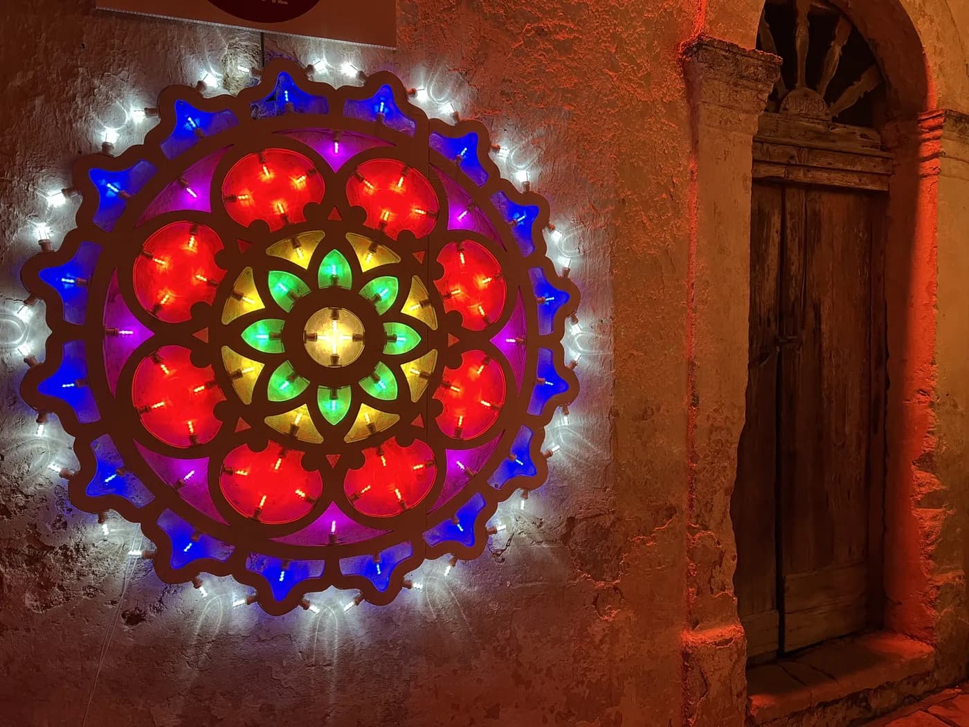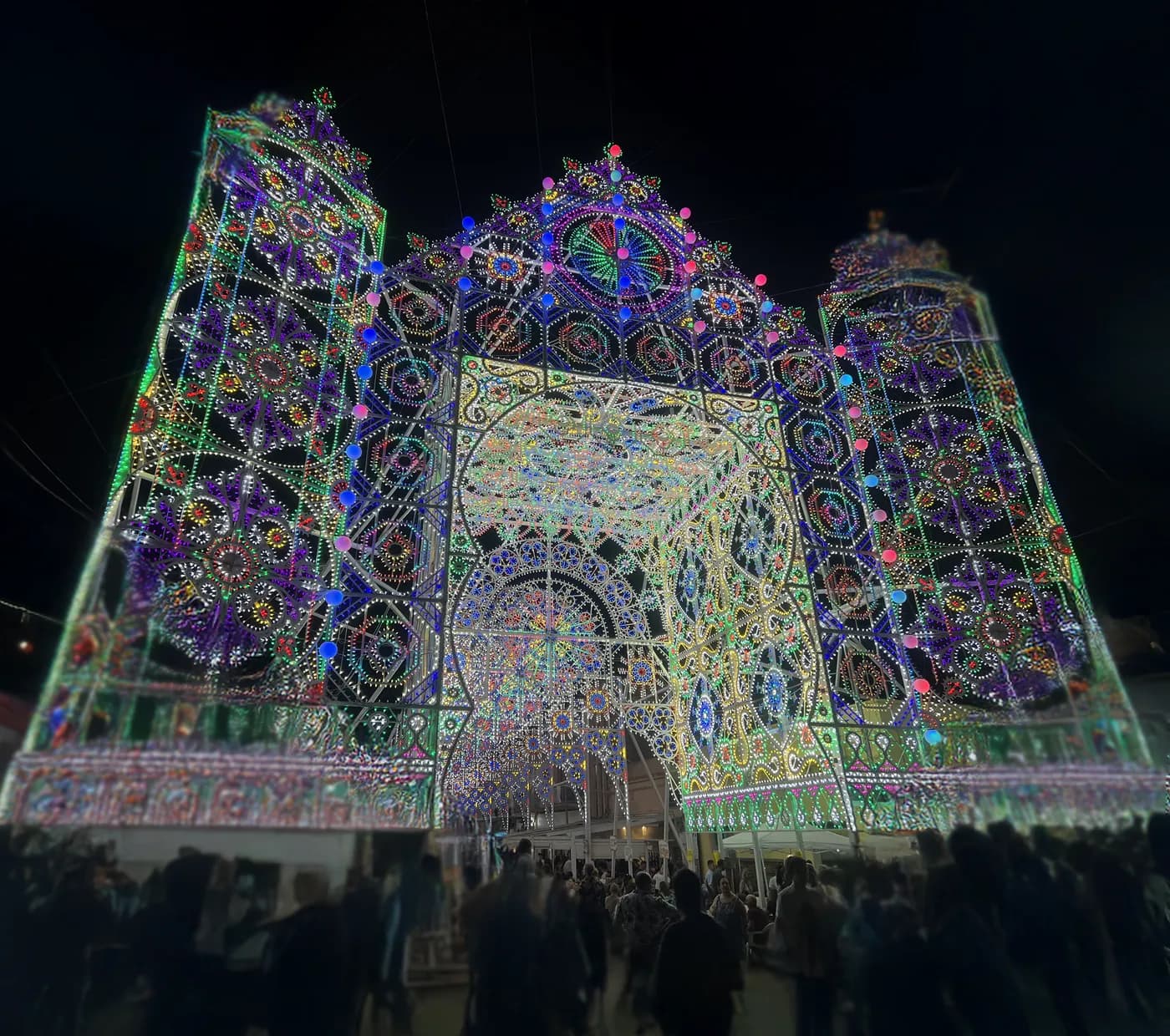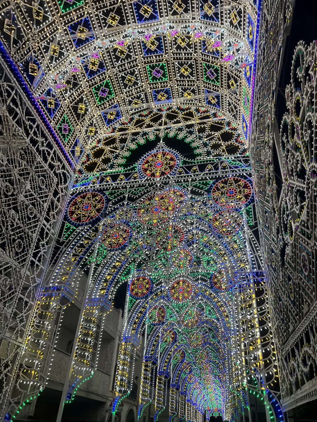 D'estate i borghi si accendono. Le luminarie — gallerie di luce che attraversano le strade — sono una tradizione unica del sud Italia. Ogni paese celebra il proprio santo patrono con architetture effimere di migliaia di luci.