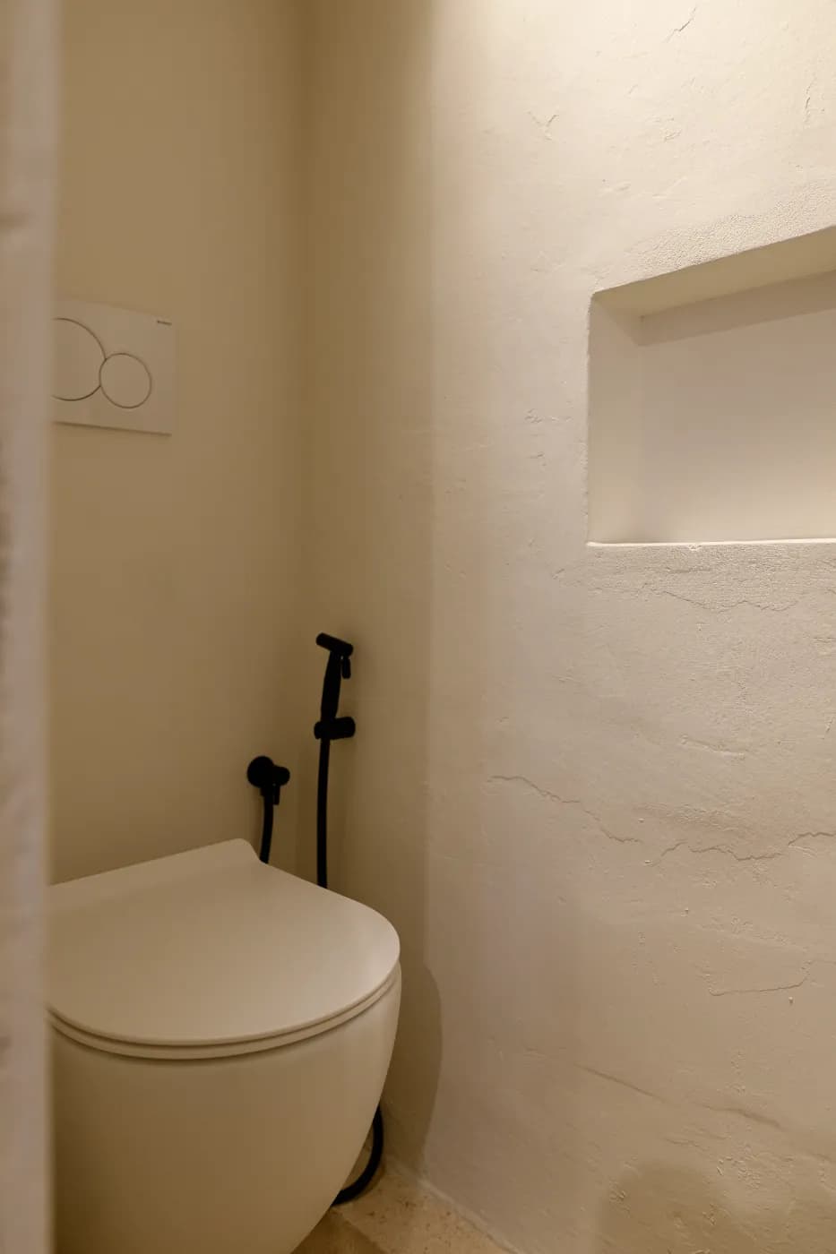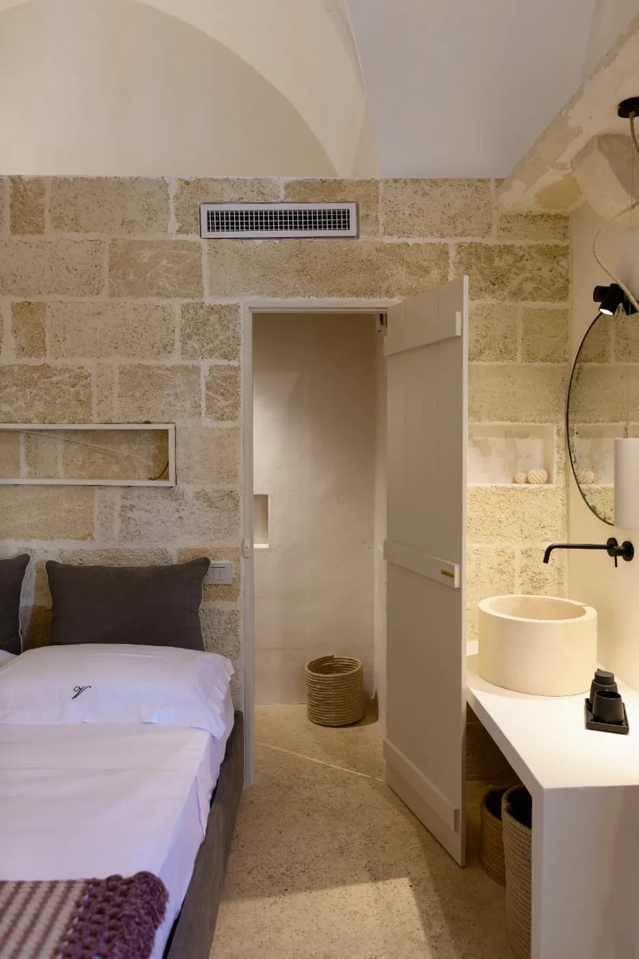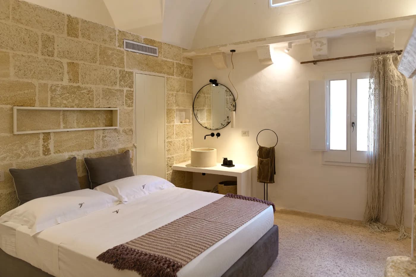 Si sale per la scala tipica salentina. La camera da letto con camino antico si affaccia sulla Chiesa Madre. La cucina con zona living apre sulla terrazza panoramica arredata, dove nelle giornate limpide lo sguardo raggiunge il mare di Gallipoli. La doccia in rame all'aperto è il dettaglio che chiude ogni giornata.