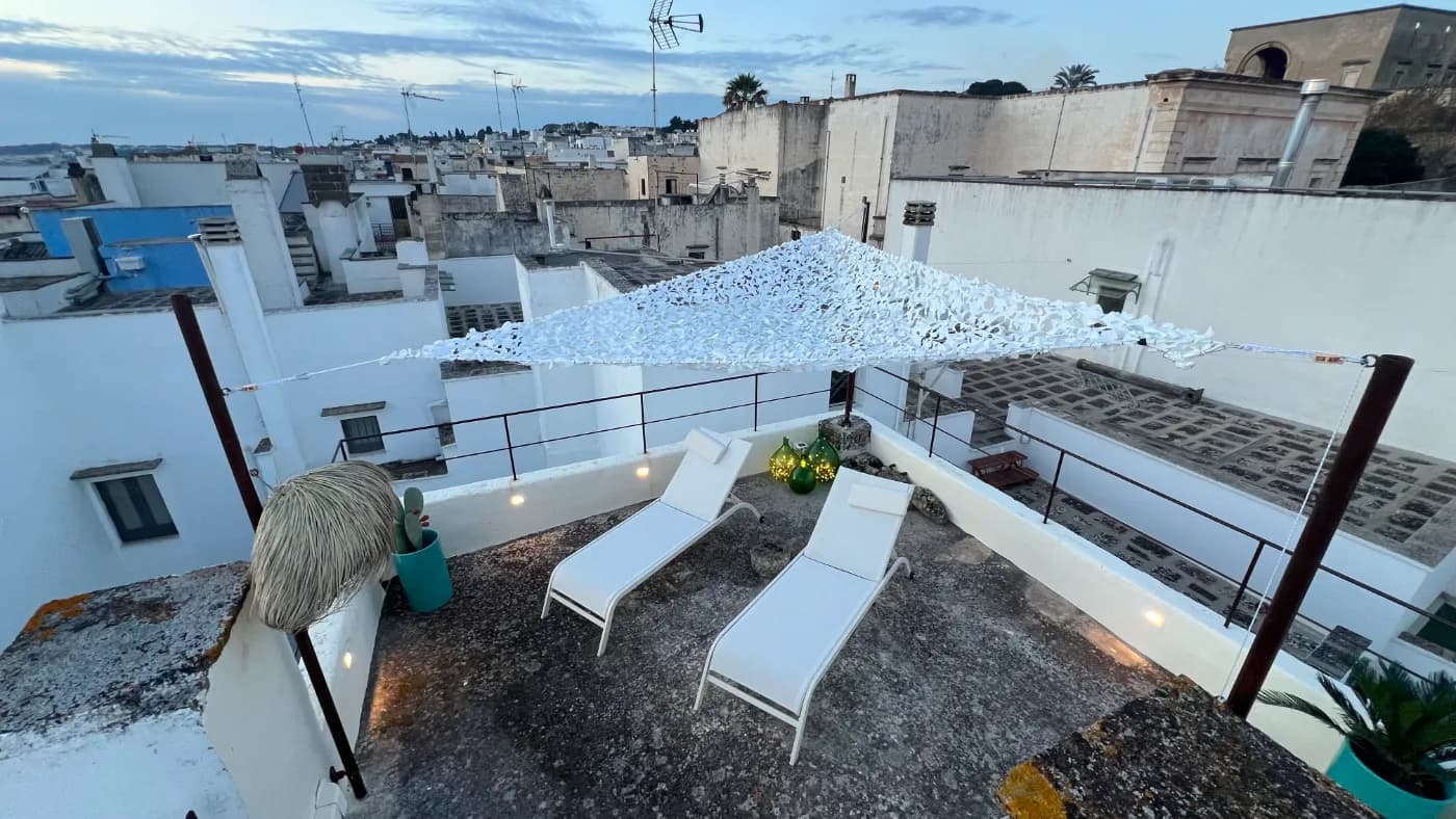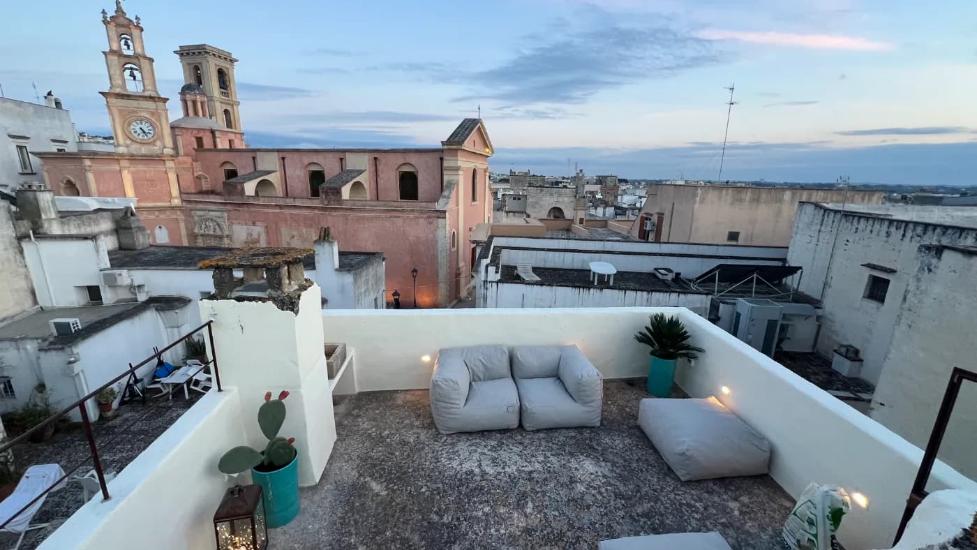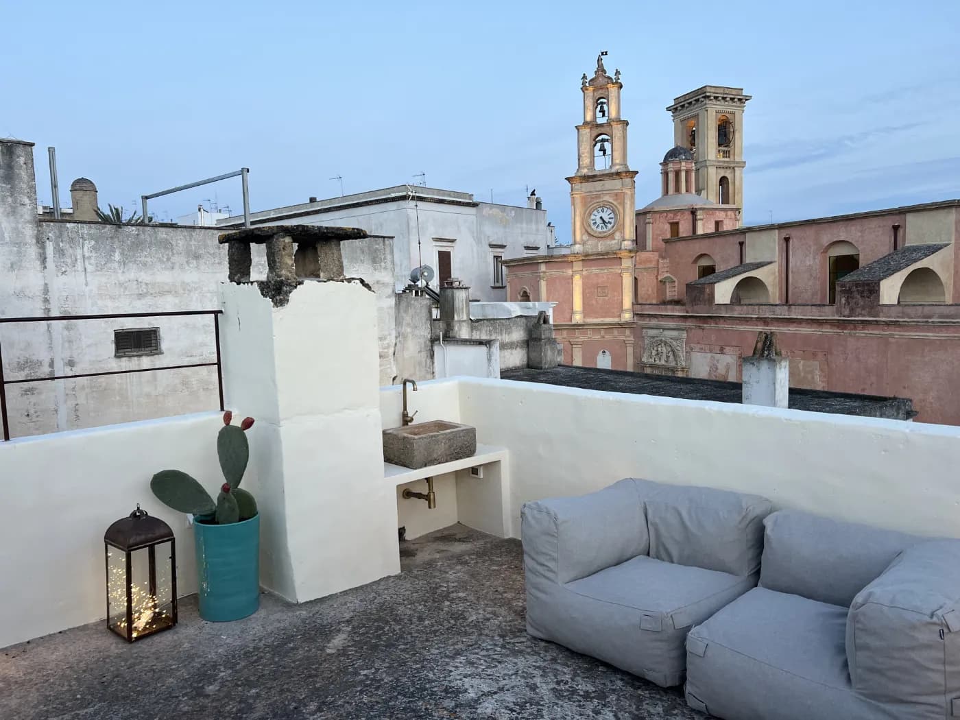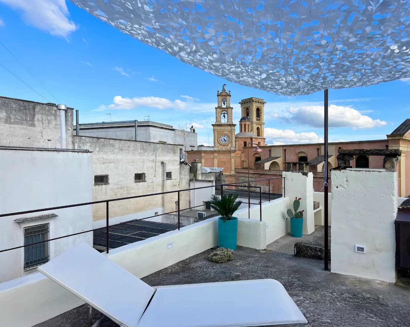 Ogni elemento è stato pensato per valorizzare la posizione unica: al primo piano del palazzo, tra i tetti del centro storico di Parabita, con una vista che spazia dalla torre dell'orologio fino alla costa ionica.