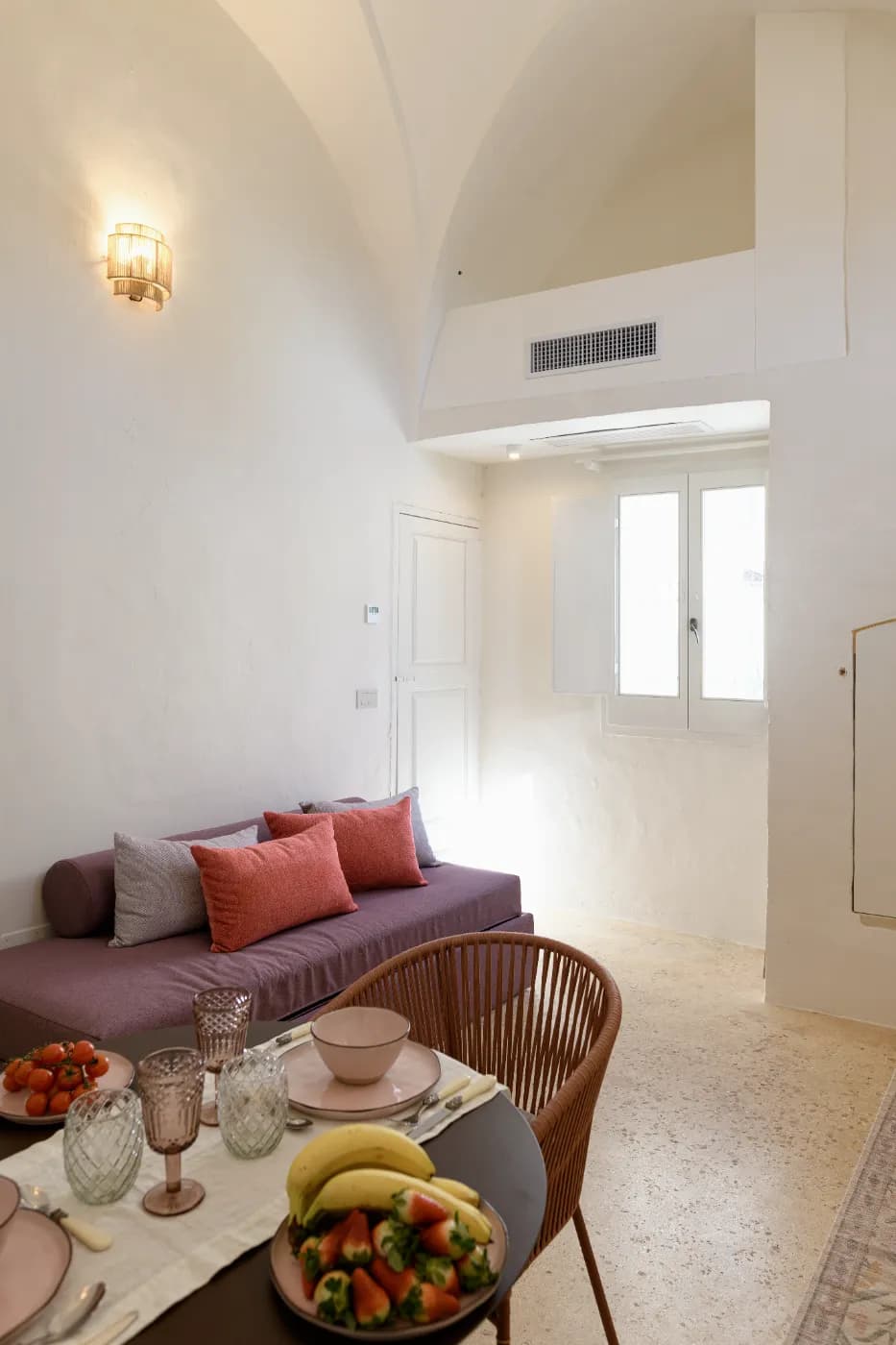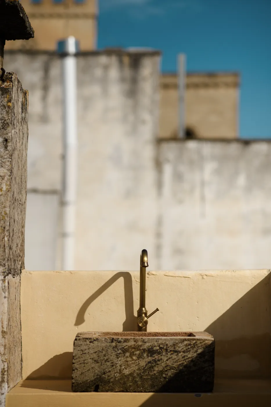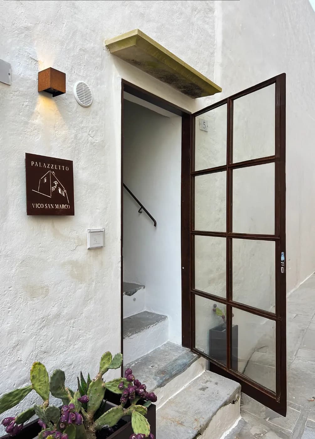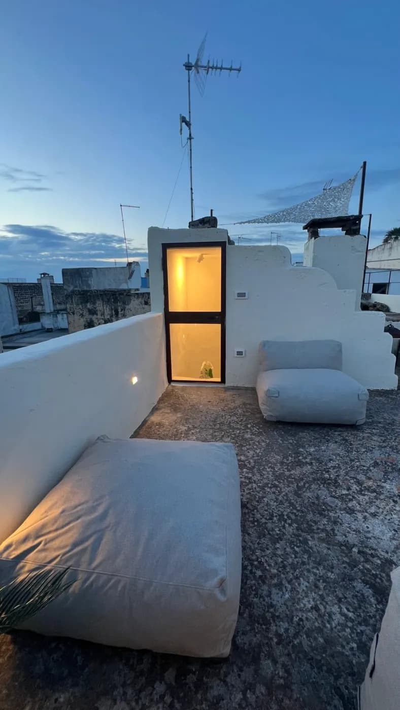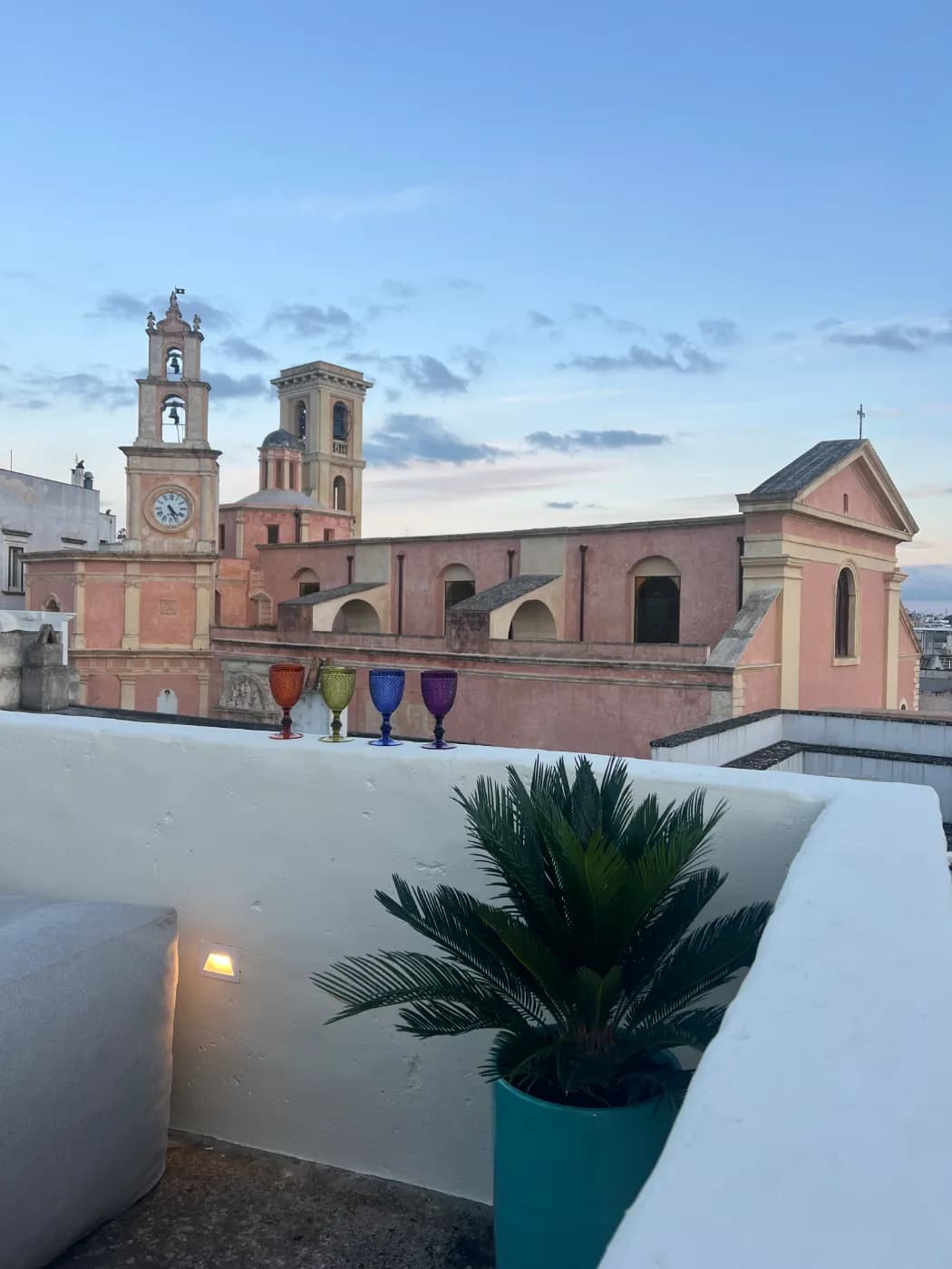 Ogni elemento è stato pensato per valorizzare la posizione unica: al primo piano del palazzo, tra i tetti del centro storico di Parabita, con una vista che spazia dalla torre dell'orologio fino alla costa ionica.
