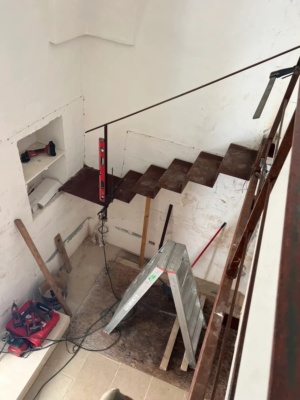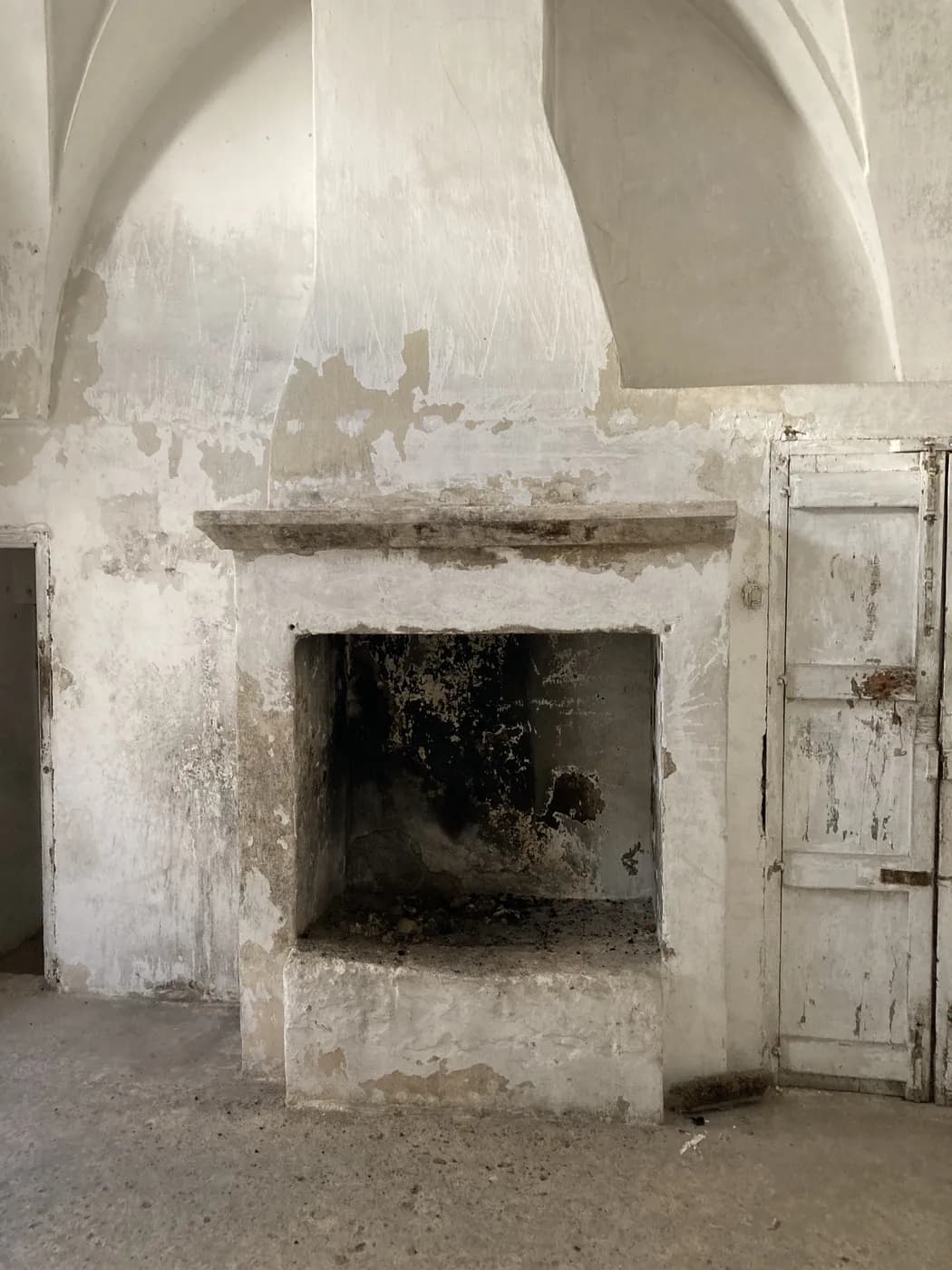 Il camino antico, le scale in pietra, i cancelli in ferro battuto, le porte in legno massello: tutto ciò che era recuperabile è stato restaurato e rimesso in funzione. Le poche integrazioni nuove — i bagni, la cucina, gli impianti — sono state realizzate con materiali coerenti e artigiani locali.