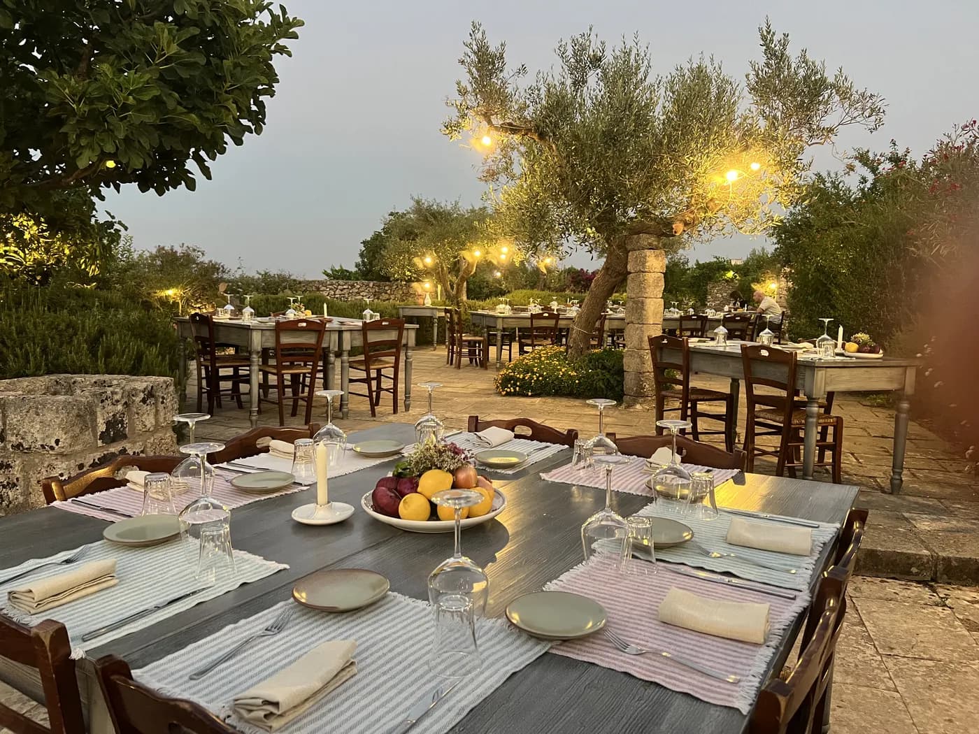 Quando il sole scende, il Salento cambia ritmo. Si cena all'aperto sotto gli ulivi secolari, con il vino del territorio e la luce calda delle lanterne. I ristoranti che vi consiglieremo non sono quelli delle guide — sono quelli dove vanno i locali, dove il pesce arriva la mattina e il pane si fa ancora a mano.